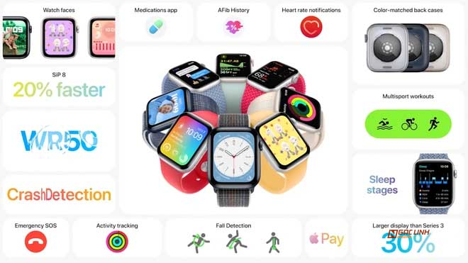 Sản phẩm tiếp theo được giới thiệu là Apple Watch SE. Phiên bản đầu tiên của dòng SE được giới thiệu từ 2020. Phiên bản mới tiếp tục duy trì những tính năng cốt lõi. Vốn đã xuất hiện trên dòng đồng hồ thông minh đến từ Apple. Thiết bị có màn hình lớn hơn 30% Apple Watch Series 3 và nhanh hơn 20%. Với 3 phiên bản màu sắc, Apple Watch SE mới có giá khởi điểm từ 299 USD.