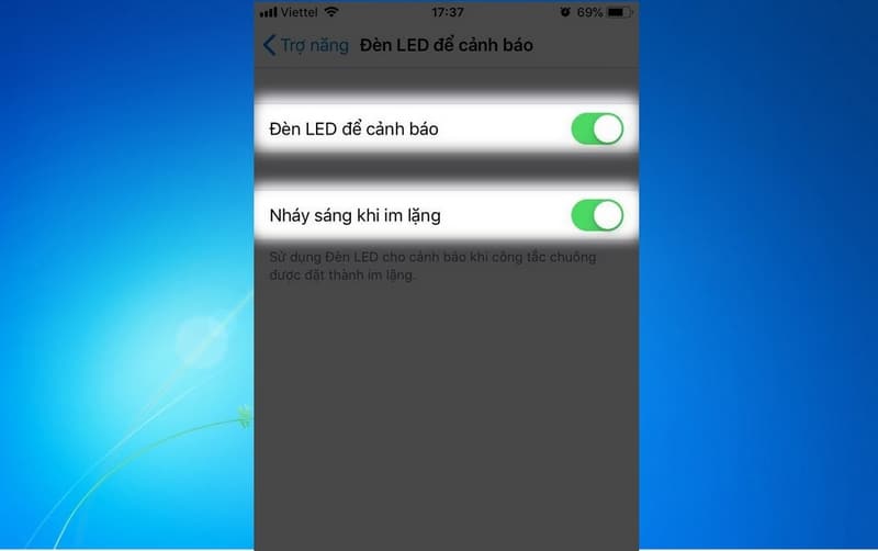 Bước 4: Chạm vào gạt nút màu xanh để bật đèn flash LED cho Cảnh báo và nháy sáng như im lặng như hình.